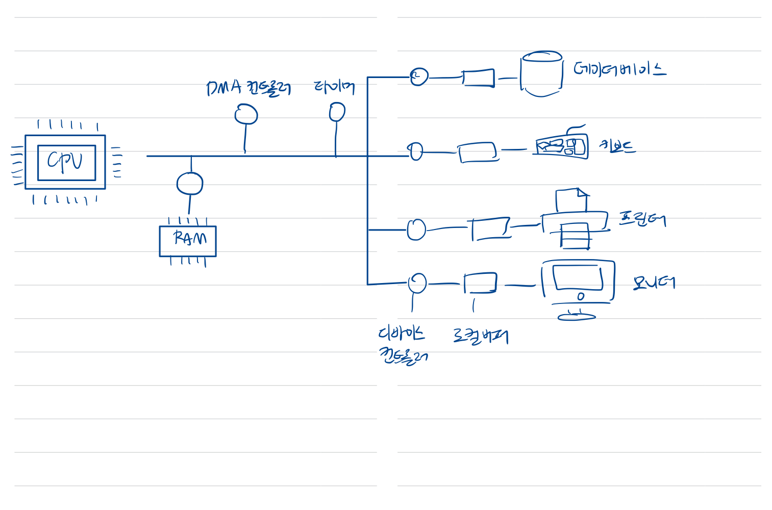 - DMA 컨트롤러: I/O 디바이스가 메모리에 직접 접근할 수 있도록 하는 하드웨어 장치. CPU 부하를 덜어줌.